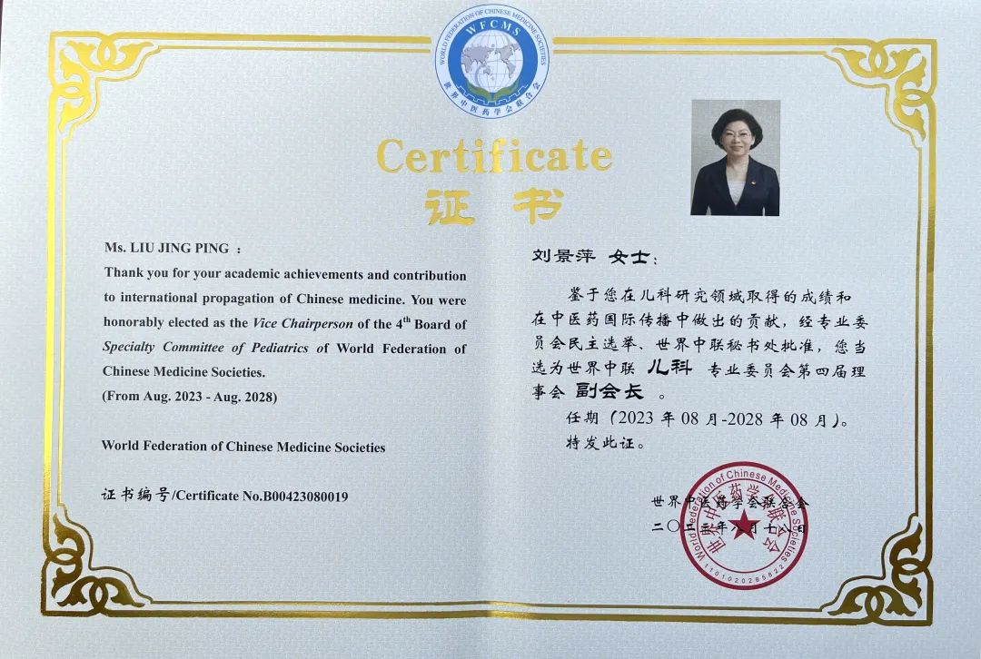 ks凯时药业集团党委书记、董事长刘景萍当选世界中医药学会联合会儿科专业委员会第四届理事会副会长